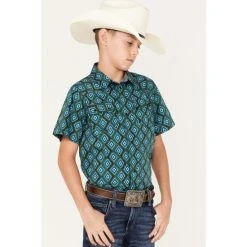 Cheapest ✨ Cody James Boys’ Diamond Geo Print Short Sleeve Western Snap ???? Shirt Dark Green ????
