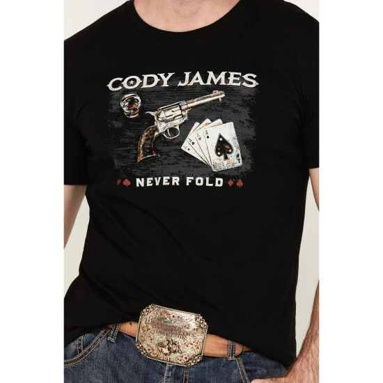 - “Cody James Never Fold” with revolver and playing cards graphic on back